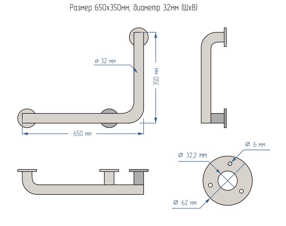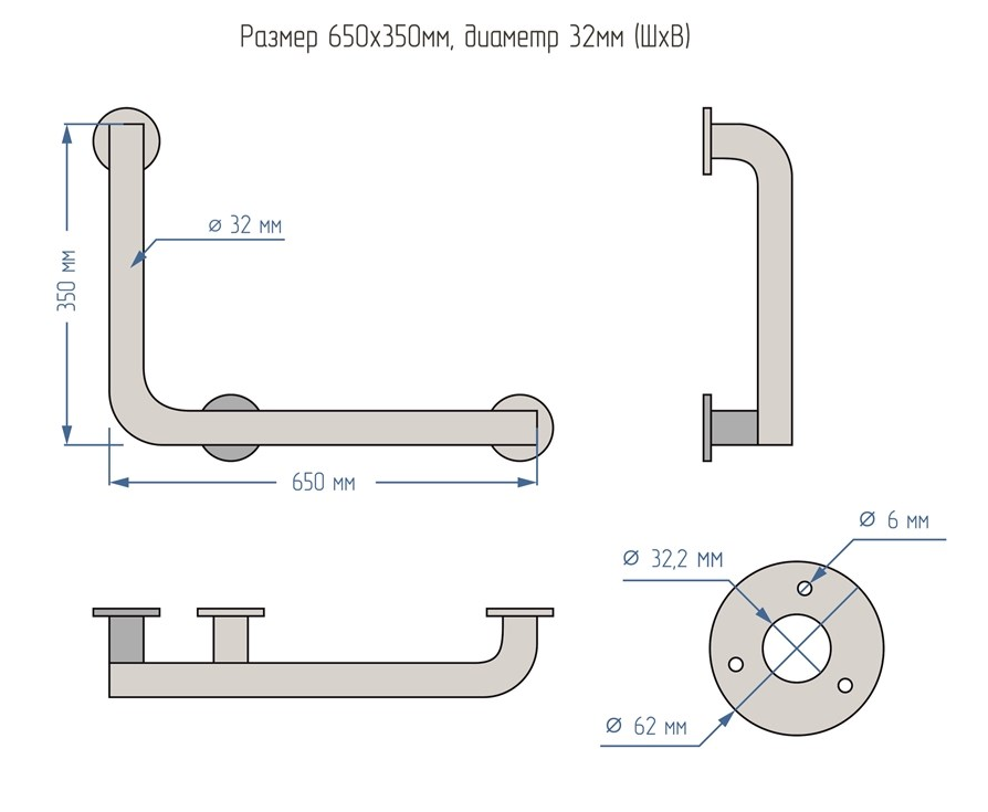 Поручень для инвалидов для ванны и душа настенный Г-образный 350х650мм - Левый